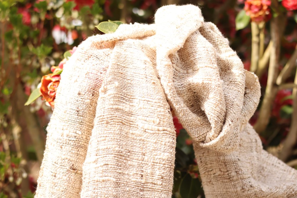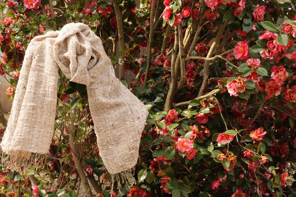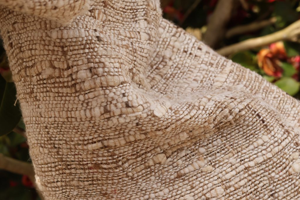 今回は以前の糸に比べて毛糸感少な目、その分野蚕糸らしいエリ蚕糸で織ったストールの紹介です。