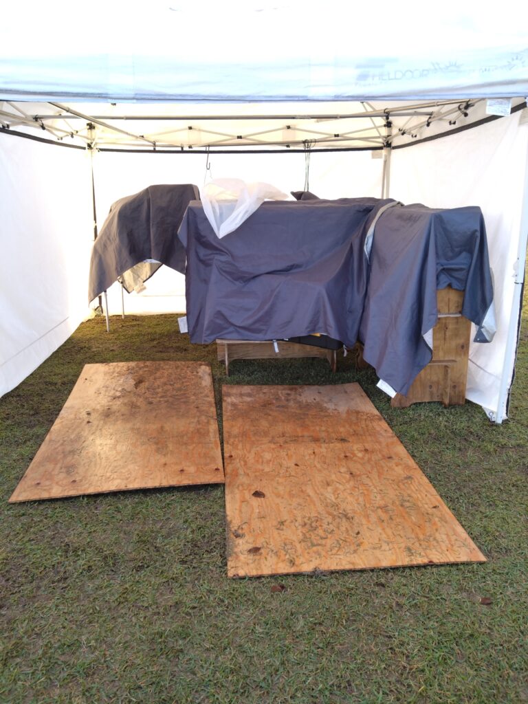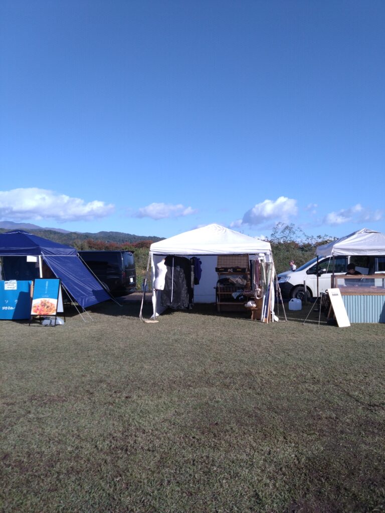 初日土曜日が☔予報だったので金曜日前日搬入を無事済ませて、その日夜からほぼ一晩降り続いた雨も翌朝には弱まって「良かった~♡」と思いながら会場に足を踏み入れた途端に「これはまずい!」に…というのが会場の水捌けが悪くて芝生がぐじゅぐじゅ状態、まいったな~と思いながらとりあえず品物を落としたら汚れてダメになる!を自分に言い聞かせ細心の注意を払いつつ開店準備をしながらのタオルに水を吸わせて絞るの焼け石に水的な排水作業、途中スタッフさんが入り口近くにべニア板を敷いてくれたりしたおかげでなんとかお客さんが立ち寄ってくれる状況にこぎつけて開催時間を迎えるられましたが…そのあとがまた今度は結構強い川風に(河川敷公園というだけあって会場のすぐそばを寒河江川がながれています)テントがだいぶヤバかったようで自分がというよりも周りの出店者さんやスタッフさんが心配してくれてペグを打ち直したり、ロープを張り足したりと補強してくれてありがたかったです。