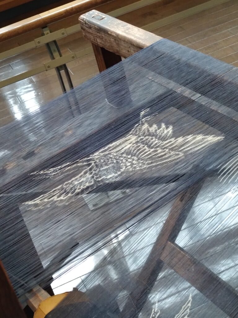 高機にかかっていた精巧な鶴の経絣糸
