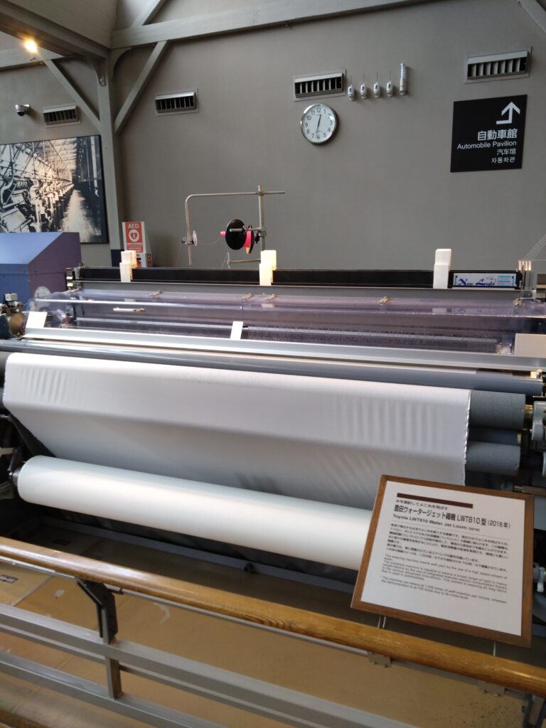 アイヌのアッシ?織りの地機から始まり上布等を織る地機→高機→バッタン織り機→数々の力織機にジャガード織り機、そして今でも1軍扱いのレピア織り機も紹介していましたが…そんなのはもうベテラン過去選手の織り機的扱いでそのあとの最新のウオータージェット織り機やエアジェット織り機にパソコン制御のジャガード織り機までが動体展示されていました。