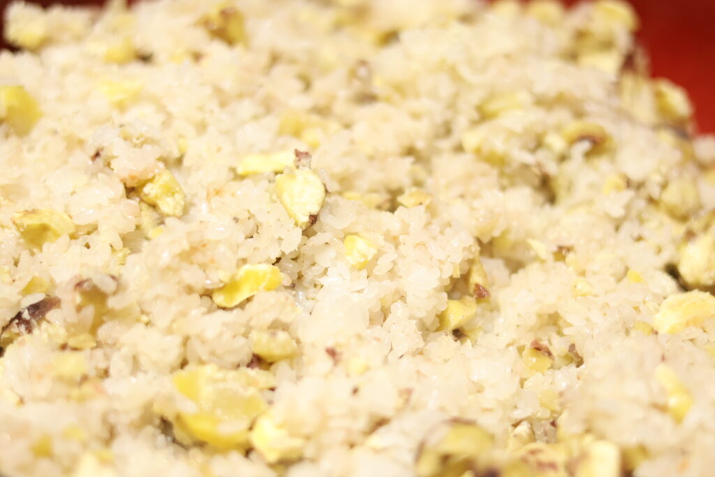 栗おこわ 2025年10月14日 最終更新日時 : 2025年10月14日 mano 今朝は先週拾って皮むき後冷凍していた栗を栗おこわにしました。 拾った栗全部を投入した栗どっさりの贅沢な仕上がりで朝から美味しくいただきました。 もっと栗が食べたいと思ったけれど…栗の収穫シーズンはもう終わり来年の楽しみにします。 FacebooktwitterHatenaPocketCopy