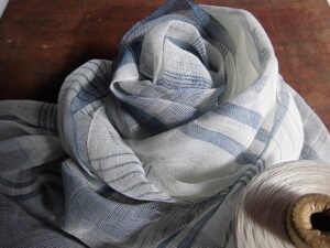 前に経緯タッサーシルクで織ったストールの残り経糸に緯糸のポイントにネパールのカラフルな布裂太糸をポイントに織り込んだストールを織っています。この太糸結構強い撚りが入っているので、織り終わって手織り機から降ろしての仕上げ後 […]